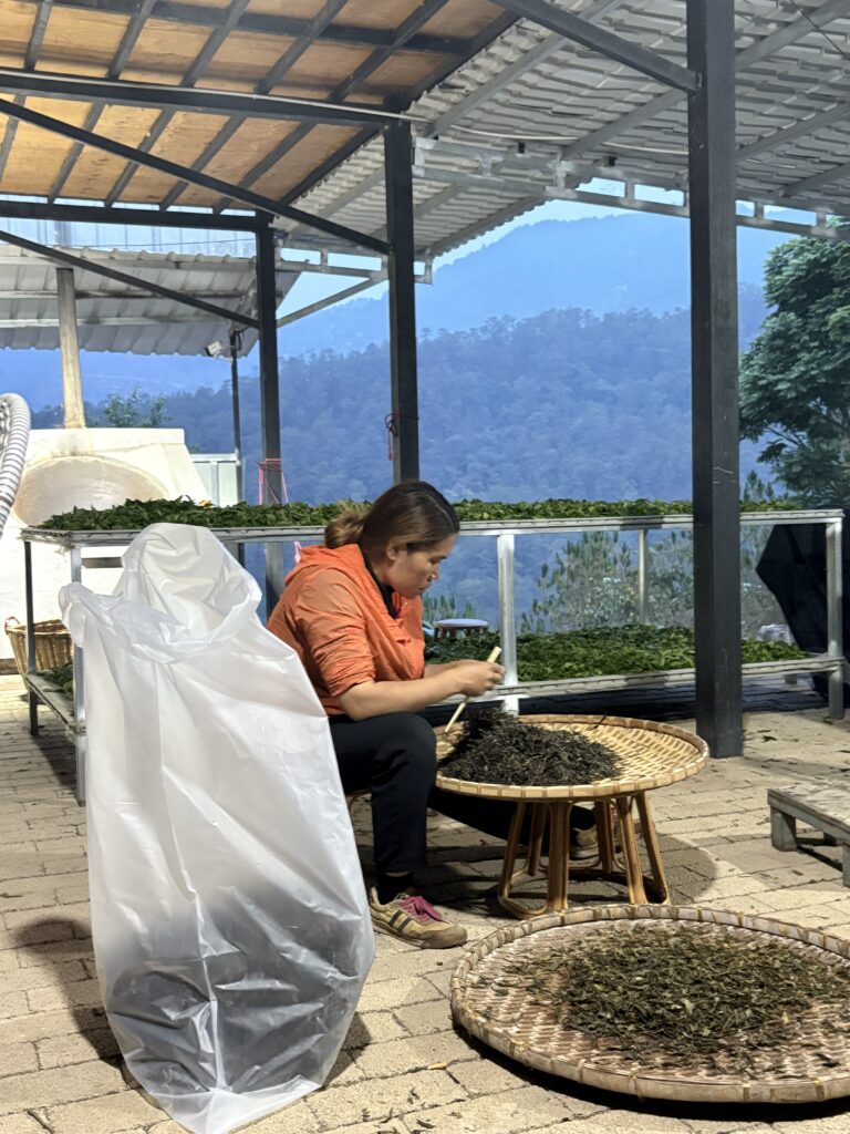 发完文之后我继续在寨子转悠,之后随机的遇到一个晒茶叶的男主人去看他晒茶叶,就看到了前一天晒好的,于是就有了试3泡茶的故事,为什么是3泡茶,我们一起随行3人,茶农家每一片地的茶都是分开的,于是我们各拿了一泡自己看上的,最终我选的那片地完美胜出,并且是我比较喜欢的风格。