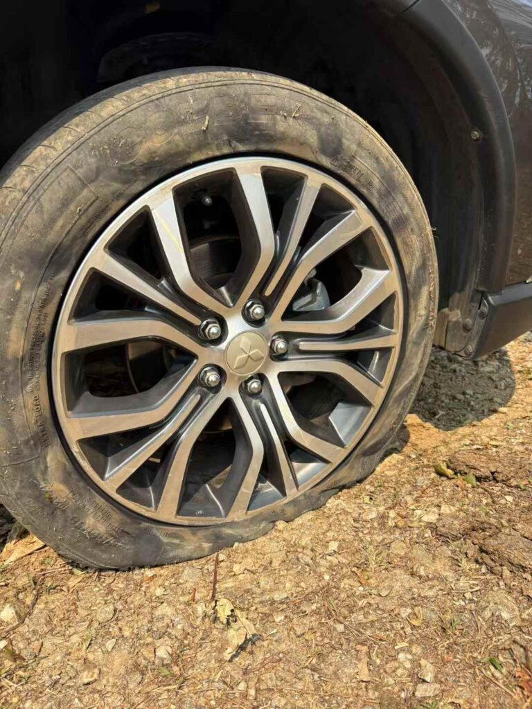 昨日到老曼峨,中途去了坝卡龙一处茶地,车子右前轮爆胎,好久没有换轮胎的经历了。