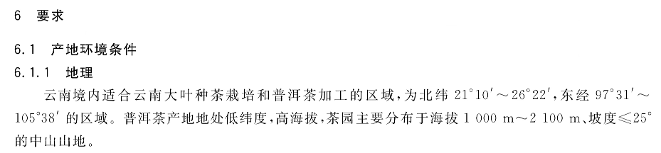 云南境内适合云南大叶种茶栽培和普洱茶加工的区域,为北纬21°10’~2622,东经97°31~10538’的区域。普洱茶产地地处低纬度,高海拔,茶园主要分布于海拔1000m~2100m、坡度<25的中山山地。