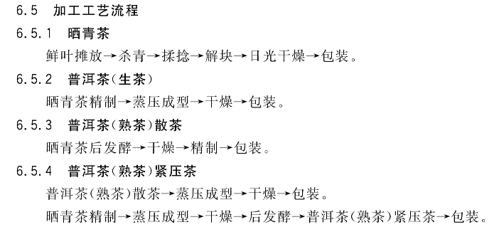 根据以上国标中的规定,我们可以得出结论:普洱生茶在未紧压之前可以称为大叶种绿茶或晒青茶,紧压后称为普洱茶(生茶);普洱熟茶不属于黑茶,因为在普洱熟茶的国标中,散熟茶在后发酵的工艺中;普洱茶的后发酵是区别于其它茶类的重要工艺。但我们在实践中形成的共识是——晒青茶在散装状态下也会进行后发酵,这也是普洱茶界都希望普洱茶成为六大茶类之外的第七大茶类原因。