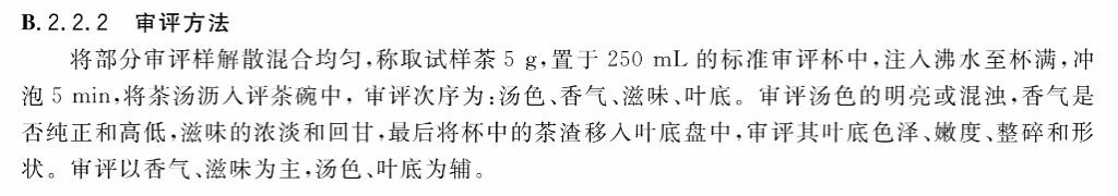 B.2.2.2 审评方法将部分审评样解散混合均匀,称取试样茶5g,置于250mL的标准审评杯中,注入沸水至杯满,冲泡5min,将茶汤沥人评茶碗中,审评次序为:汤色、香气、滋味、叶底。审评汤色的明亮或混浊,香气是否纯正和高低,滋味的浓淡和回甘,最后将杯中的茶渣移入叶底盘中,审评其叶底色泽,嫩度,整碎和形状。审评以香气、滋味为主,汤色、叶底为辅。