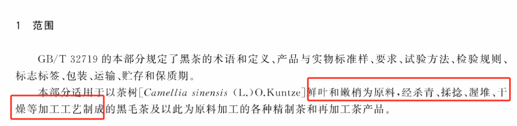 本部分适用于以茶树[Camellia sinensis(L.)O.Kuntze]鲜叶和嫩梢为原料,经杀青、揉捻、渥堆、干燥等加工工艺制成的黑毛茶及以此为原料加工的各种精制茶和再加工茶产品。